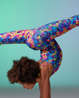Be ready to POP in this beautifully vibrant piece. Perfect for the stage, this eye-catching unitard will add some zing to any performance.