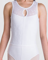 - High neck coverage leotard, with velvet and mesh leaf fabric over a tactel bodice, and oval cutouts in the front and back.