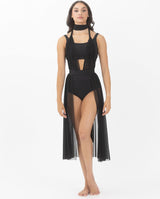 Wrap, twist, and tie the two long mesh panels into any style you want. Create one single look or individual styles in a group. The overdress has two mesh bands and a 3/4 skirt attached to waistband, to wear over top and bottoms, or a leotard.