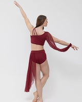 This stunning two-piece lyrical set features a one-sleeve slit design and three connected straps on the opposite shoulder. The briefs have a wide waistband and long side mesh panel.