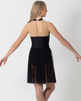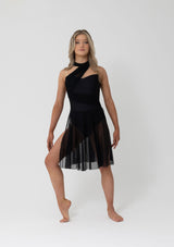 Featuring a high-neck mesh detail that sweeps elegantly across the bodice, this design creates a modern asymmetrical look while offering secure coverage. A mid-length sheer mesh skirt flows effortlessly over a built-in leotard base, complete with side splits for added fluidity and expression.