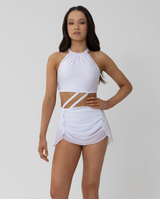 Featuring a high halter neckline with soft gathers, this costume flows into a sleek cropped bodice highlighted by striking diagonal strap details at the waist. A ruched mesh skirt drapes elegantly over matching briefs, creating movement and texture that enhances every performance.