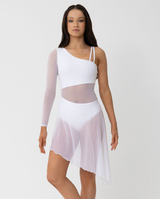 A single long mesh sleeve offers graceful coverage on one arm, while the opposite side showcases an elegant double-strap detail. The asymmetry continues through the skirt, where soft mesh drapes diagonally for beautiful movement that mirrors your choreography.
